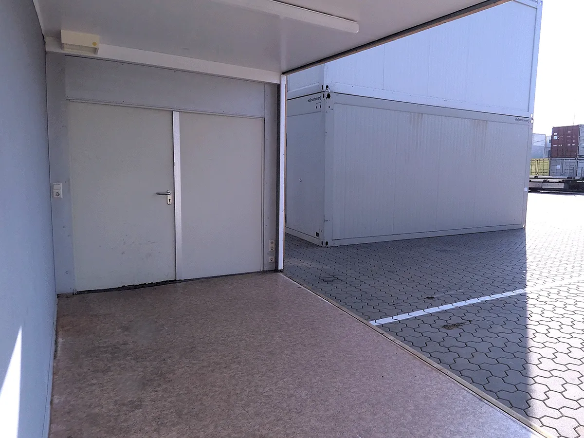Dieser gebrauchte 20-Fuß-Bürocontainer bietet auf ca. 15 m² Nutzfläche eine auffällige Ausstattung mit schwerer Doppelflügeltür sowie marmoriertem PVC-Boden und eignet sich für den Einsatz als Büro- oder Funktionscontainer. Eine Elektroinstallation (400/230 V, CEE 32 A) ist vorhanden. Hinweis: Ehemaliger Anlagenteil – eine Seitenwand fehlt. Standort des Containers ist Frankenberg/Sachsen. Bemerkungen zum Zustand: Bodenschäden, Rost sowie optische Gebrauchsspuren im Innen- und Außenbereich. Außenmaße: 6.055 × 2.435 × 2.890 mm.
