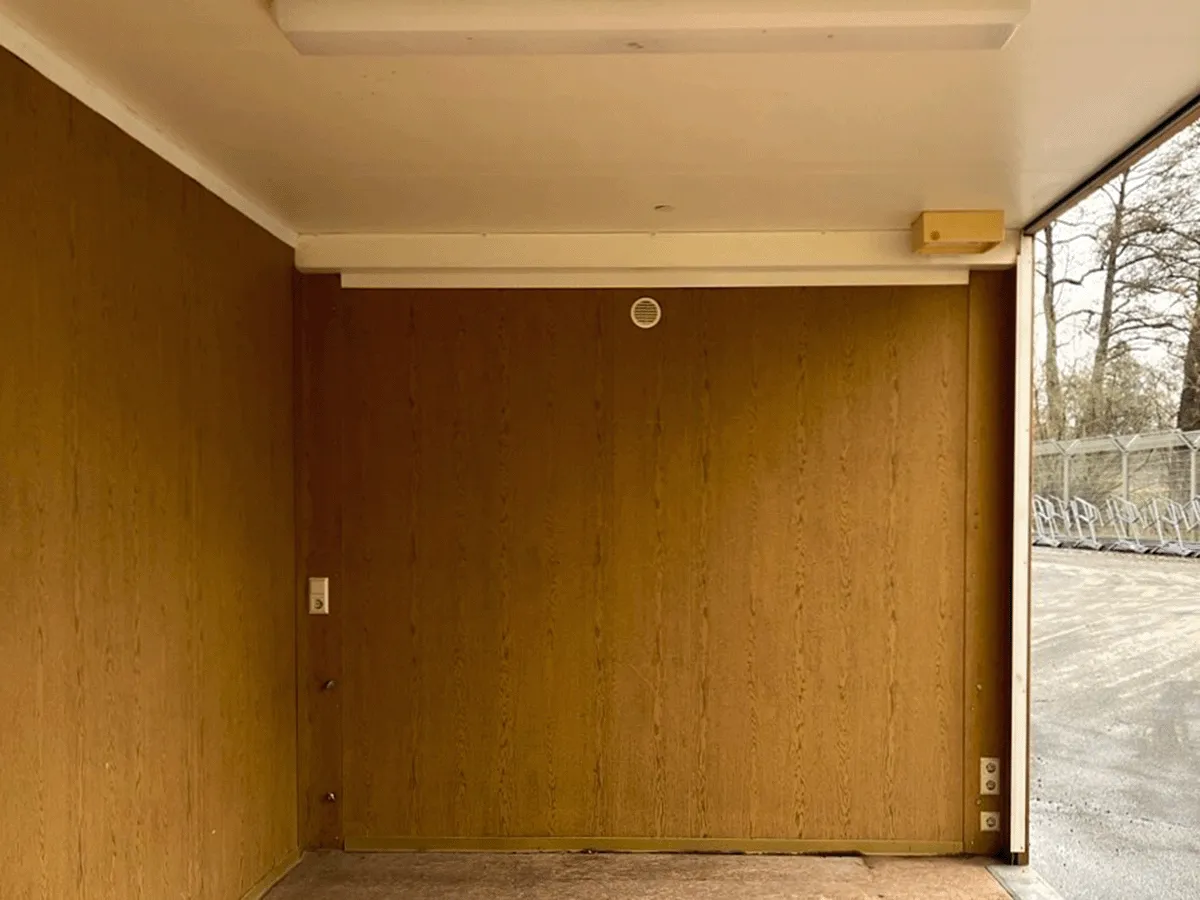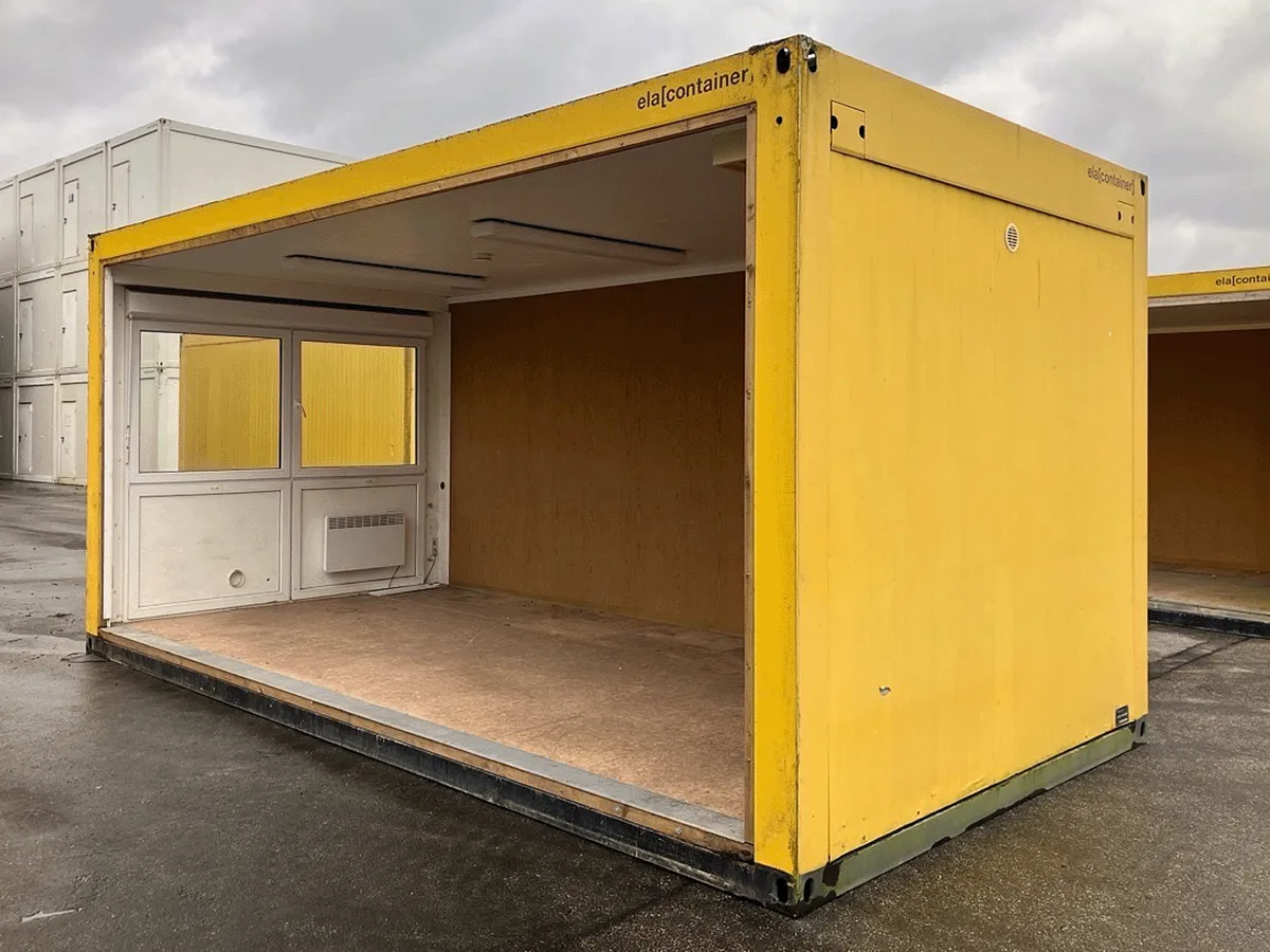 Dieser gebrauchte 20-Fuß-Bürocontainer in 3 m Breite bietet auf ca. 18 m² eine funktionale Grundfläche für den Einsatz als Arbeits- oder Aufenthaltscontainer. Die Innenausstattung umfasst eine Wandverkleidung in Eiche-/Holzoptik sowie eine große Fensterfront an der Stirnseite für natürliche Belichtung. Die Außenfarbe ist Goldgelb. Durch bauliche Anpassungen fehlt eine Seitenwand. Bemerkungen zum Zustand: Elektronik allgemein vorhanden, Boden stellenweise weich oder beschädigt, Wandverkleidung stellenweise beschädigt, Korrosionserscheinungen, standzeitbedingter Geruch, Feuchtigkeitsrückstände, vorhandene Türausschnitte sowie allgemeine Gebrauchsspuren im Innen- und Außenbereich, inklusive beschädigter Zier- und Fußleisten. Maße: 6.055 × 3.000 × 2.890 mm. Standort: Moosburg.