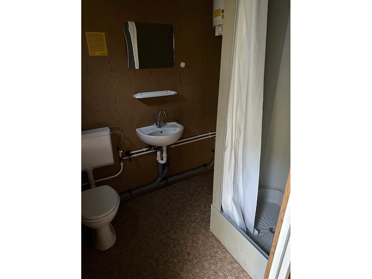 Dieser gebrauchte 20-Fuß-Bürocontainer mit 3 m Breite bietet auf ca. 18 m² Nutzfläche eine kombinierte Lösung aus Büro- und Sanitärbereich. Neben dem Arbeitsraum sind eine optionale Küchenzeile sowie WC und Dusche integriert. Ein Windfang unterstützt den Einsatz bei wechselnden Witterungsbedingungen. Innenwände in Eiche-/Holzoptik, Drehkippfenster mit Rollladen und eine gesicherte Außentür sind vorhanden. Elektroinstallation (400/230 V, CEE 32 A) sowie ein Wasseranschluss stirnseitig sind vorhanden; keine Trinkwassereignung. Bemerkungen zum Zustand: Bodenschäden, Bohrlöcher sowie optische Gebrauchsspuren im Innen- und Außenbereich. Außenmaße: 6.055 × 3.000 × 2.890 mm.