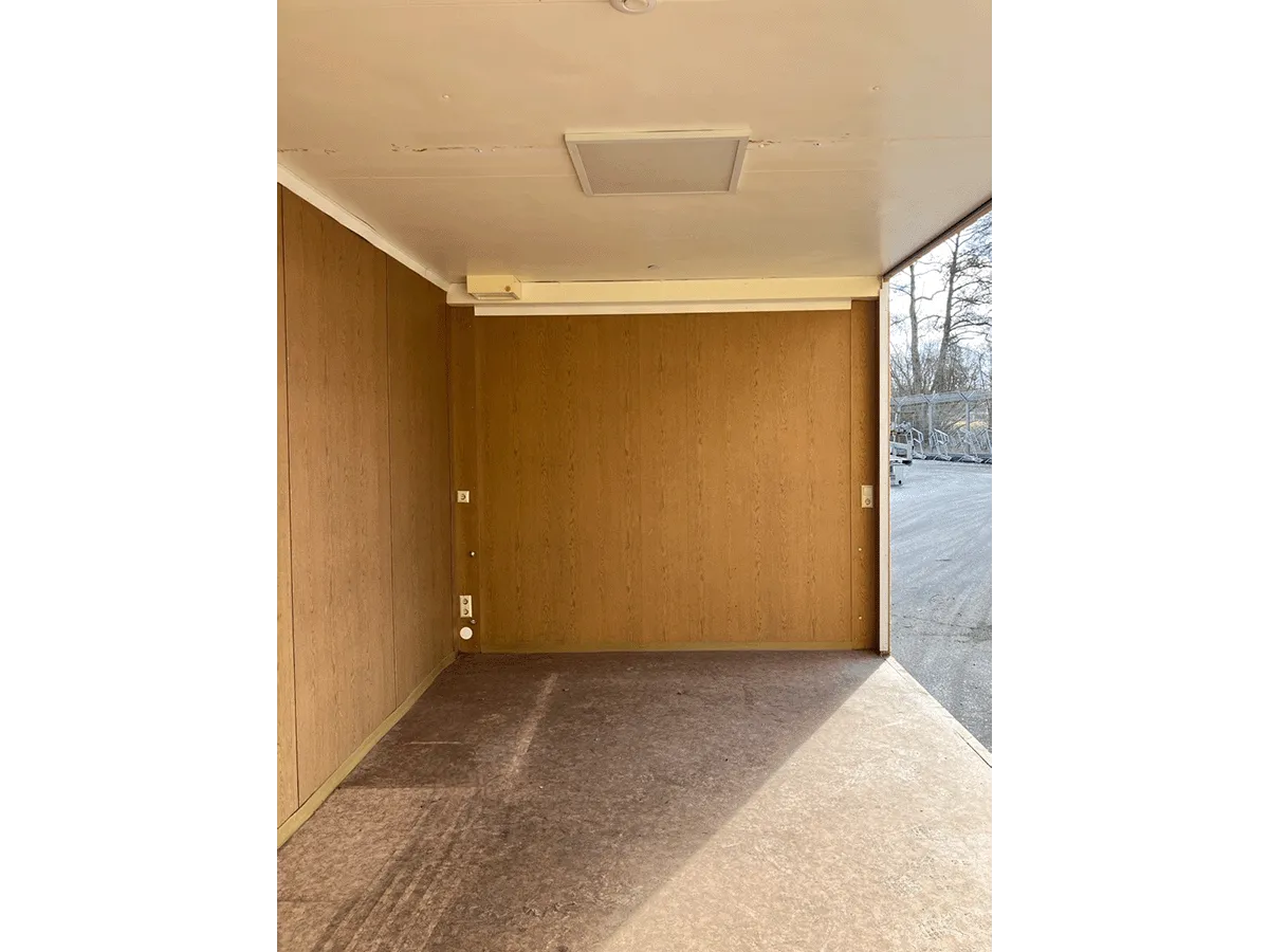Dieser gebrauchte 20-Fuß-Bürocontainer mit 3 m Breite bietet auf ca. 18 m² eine einfache Grundausstattung mit Innenwänden in Eiche-/Holzoptik und braun marmoriertem PVC-Boden. Ein Drehkippfenster mit Rollladen in der Stirnwand sorgt für Belichtung und Belüftung. Zur Ausstattung gehören zudem zwei LED-Paneele sowie eine Elektroinstallation (400/230 V, CEE 32 A) mit Steckdosen und Lichtschaltern. Die Außenfarbe ist Goldgelb. Hinweis: Anlagenteil – eine Seitenwand fehlt. Bemerkungen zum Zustand: stellenweise weicher oder beschädigter Boden, Bohrlöcher, beschädigte oder lose Deckenbereiche, Geruch, Wandlöcher, Rost sowie optische Gebrauchsspuren im Innen- und Außenbereich. Maße: 6.055 × 3.000 × 2.890 mm.