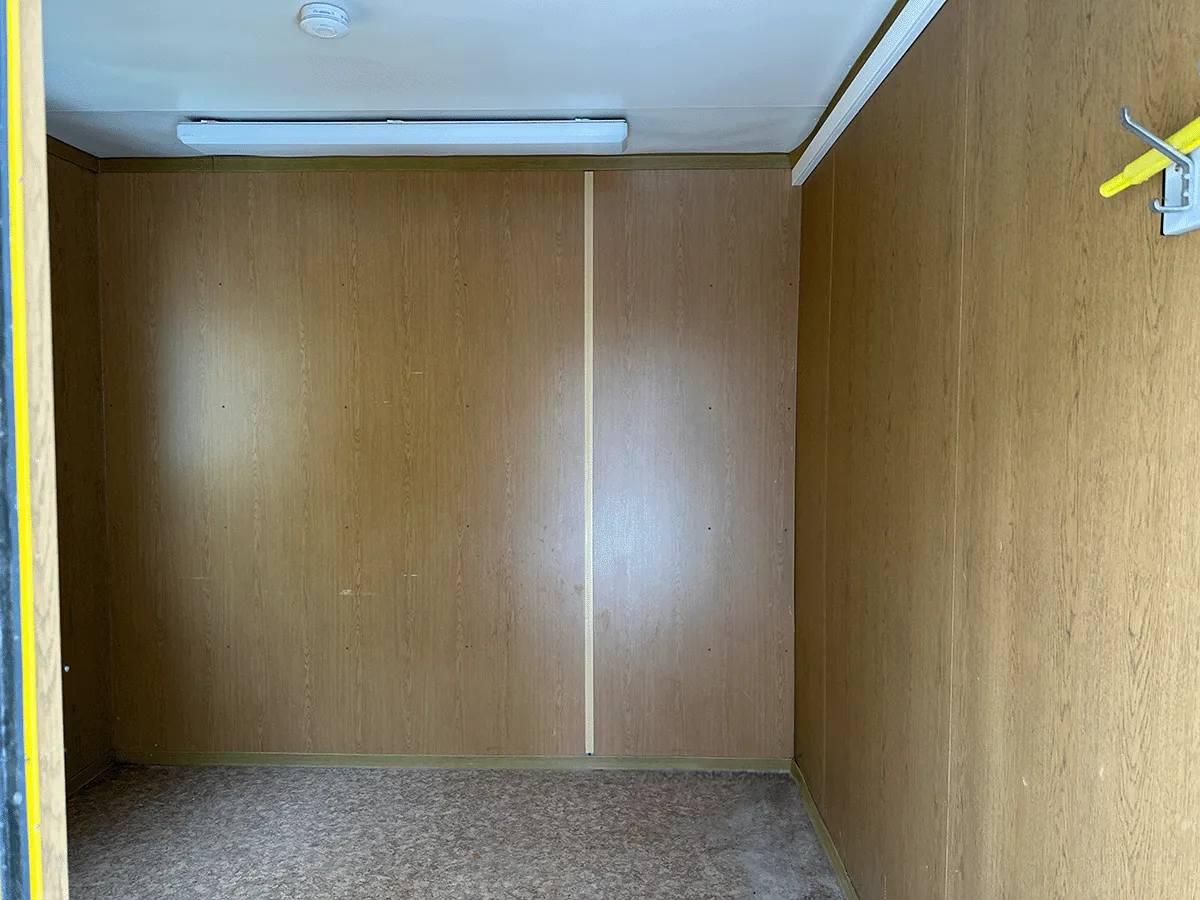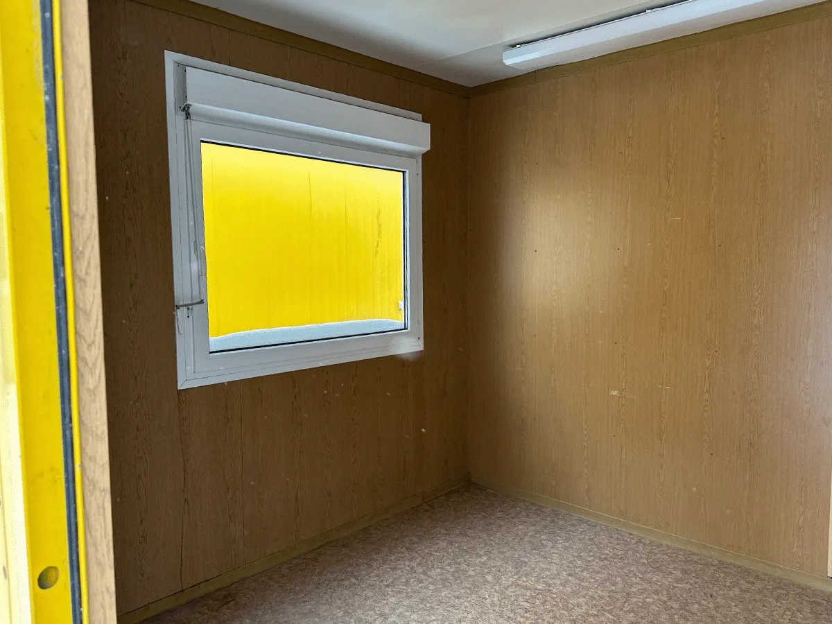 Dieser gebrauchte 20-Fuß-Bürocontainer mit 3 m Breite bietet auf ca. 18 m² eine strukturierte Raumaufteilung mit Trennwand und zwei stirnseitigen Eingängen. Dadurch lassen sich getrennte Nutzungsbereiche umsetzen, etwa für Büro- und Nebenräume. Die Innenwände in Eiche-/Holzoptik sowie der marmorierte PVC-Boden bilden eine funktionale Innenausstattung. Eine Elektroinstallation (400/230 V, CEE 32 A) ist vorhanden; die Fenster sind seitlich angeordnet und sorgen für Belichtung. Bemerkungen zum Zustand: Bodenschäden, Bohrlöcher, Rost, ein fehlender Schlüssel sowie optische Gebrauchsspuren im Innen- und Außenbereich. Maße: 6.055 × 3.000 × 2.890 mm.
