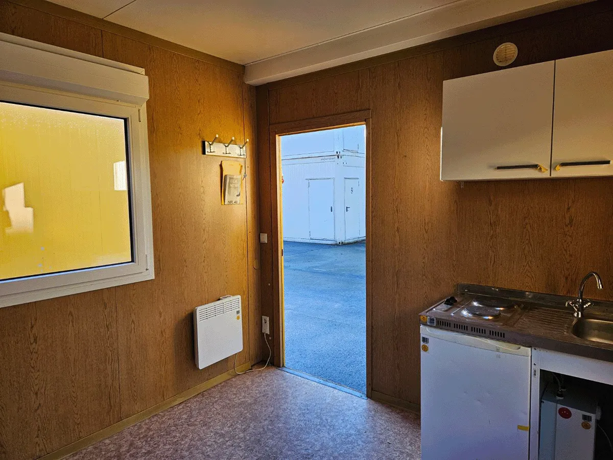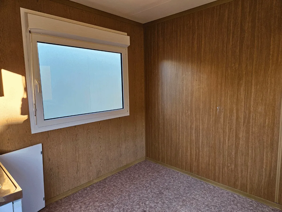 Dieser gebrauchte 20-Fuß-Bürocontainer mit 3 m Breite bietet auf ca. 18 m² Nutzfläche eine strukturierte Raumaufteilung mit integrierter Kleinstküche, Raumtrennung und beidseitigem Zugang. Zwei seitlich angeordnete Drehkippfenster mit Rollladen sorgen für Belichtung und Belüftung. Eine Elektroinstallation (400/230 V, CEE 32 A) sowie ein Wasseranschluss stirnseitig sind vorhanden; eine Nutzung als Trinkwasseranlage ist nicht vorgesehen. Bemerkungen zum Zustand: Bodenschäden sowie optische Gebrauchsspuren im Innen- und Außenbereich. Außenmaße: 6.055 × 3.000 × 2.890 mm.