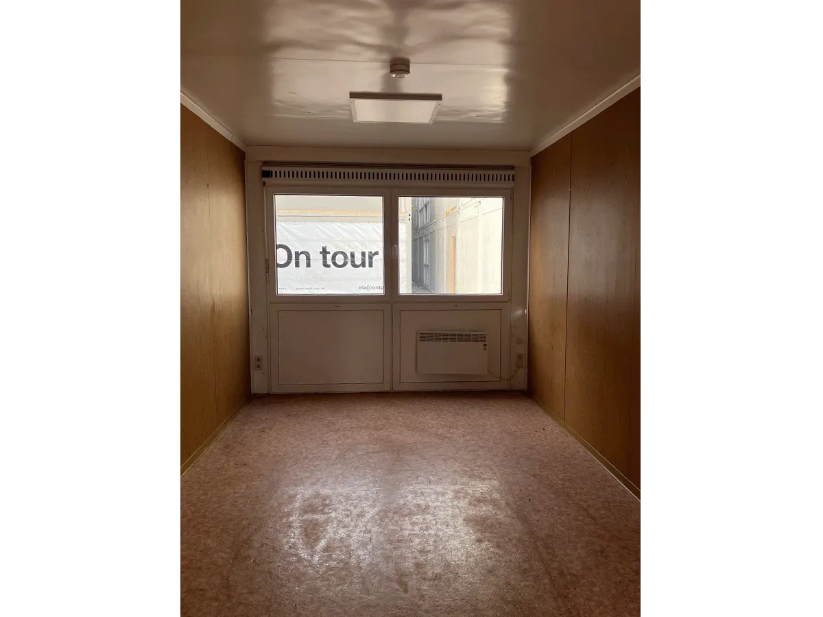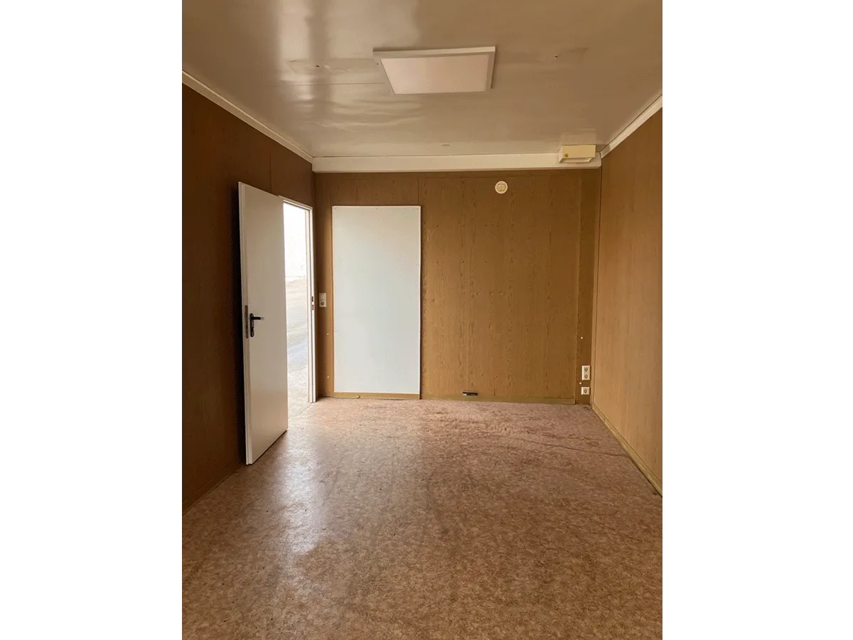 Dieser gebrauchte 20-Fuß-Bürocontainer mit 3 m Breite bietet auf ca. 18 m² Nutzfläche einen seitlichen Eingang, seitliche Türausschnitte sowie zwei LED-Paneele und eignet sich für den Einsatz als Büro- oder Funktionscontainer. Innenwände in Eiche-/Holzoptik sowie eine Elektroinstallation (400/230 V, CEE 32 A) sind vorhanden. Bemerkungen zum Zustand: Bodenschäden, Deckenlöcher, ein fehlender Schlüssel sowie optische Gebrauchsspuren im Innen- und Außenbereich. Außenmaße: 6.055 × 3.000 × 2.890 mm.