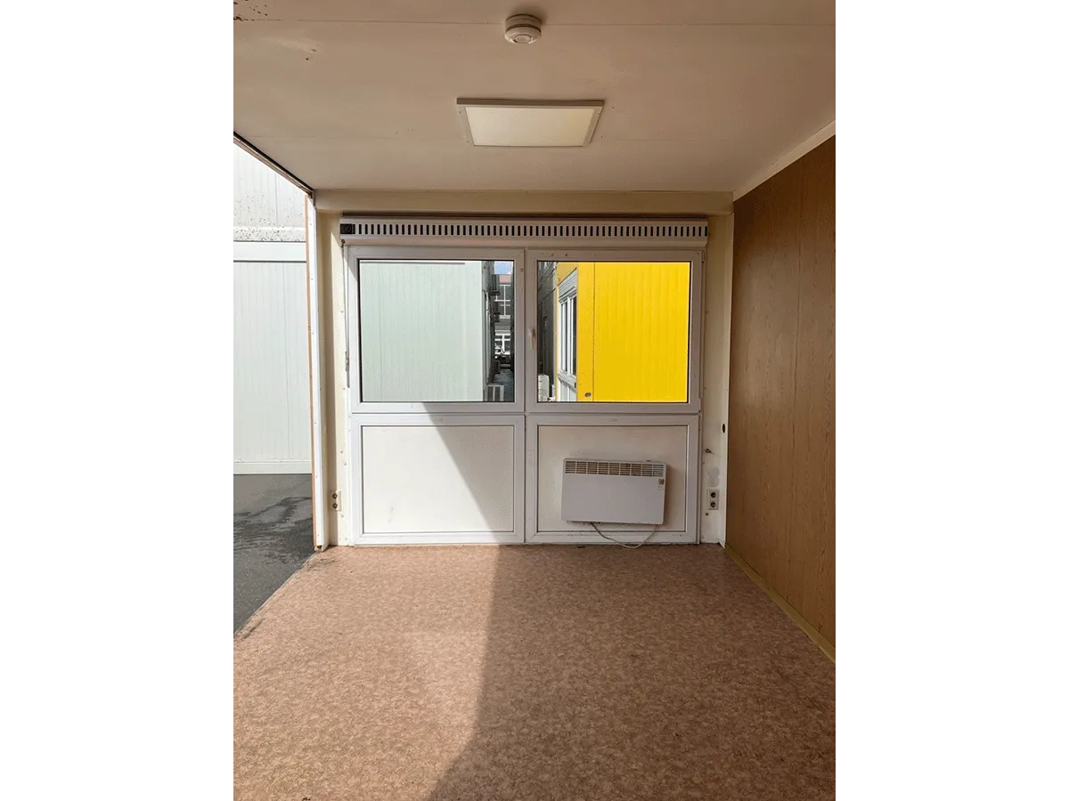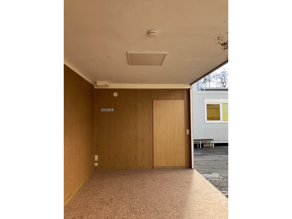 Dieser gebrauchte 20-Fuß-Bürocontainer mit 3 m Breite bietet auf ca. 18 m² eine funktionale Grundausstattung mit Innenwänden in Eiche-/Holzoptik und braun marmoriertem PVC-Boden. Ein Drehkippfenster mit Rollladen in der Stirnwand sorgt für Belichtung und Belüftung. Der Zugang erfolgt über eine MZ-Außentür in der Stirnwand. Zur Ausstattung gehören zudem zwei LED-Paneele sowie eine Elektroinstallation (400/230 V, CEE 32 A) mit Steckdosen und Lichtschaltern. Die Außenfarbe ist Goldgelb. Hinweis: Anlagenteil – eine Seitenwand fehlt, zudem sind Türausschnitte vorhanden. Bemerkungen zum Zustand: stellenweise weicher oder beschädigter Boden, Geruch, Rost, beschädigte Wandpaneele, beschädigte Zier- und Fußleisten sowie optische Gebrauchsspuren im Innen- und Außenbereich. Maße: 6.055 × 3.000 × 2.890 mm.