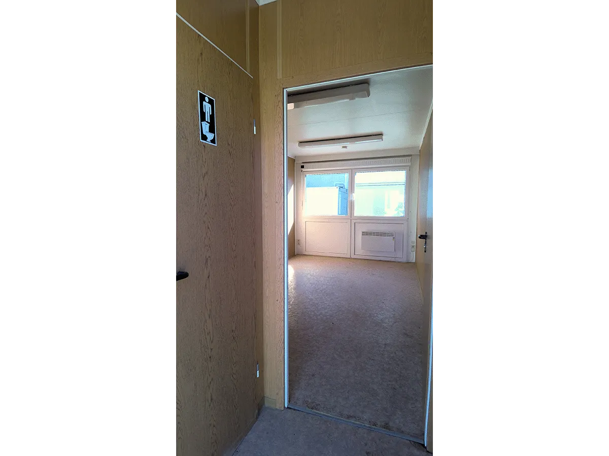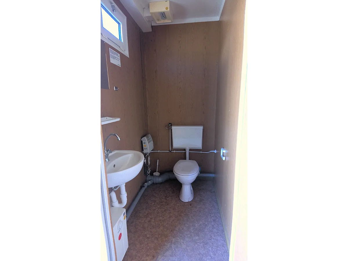 Dieser gebrauchte 20-Fuß-Bürocontainer mit 3 m Breite bietet auf ca. 18 m² Nutzfläche eine kombinierte Büro- und Sanitärlösung mit integriertem WC und Waschbecken. Innenwände in Eiche-/Holzoptik, Drehkippfenster mit Rollladen, ein stirnseitiger Wasseranschluss sowie eine Elektroinstallation (400/230 V, CEE 32 A) sind vorhanden; keine Trinkwassereignung. Damit eignet sich der Container für Standorte, an denen Arbeits- und Sanitärbereich in einem Modul benötigt werden. Standort des Containers ist Frankenberg/Sachsen. Bemerkungen zum Zustand: Bodenschäden sowie optische Gebrauchsspuren im Innen- und Außenbereich. Außenmaße: 6.055 × 3.000 × 2.890 mm.