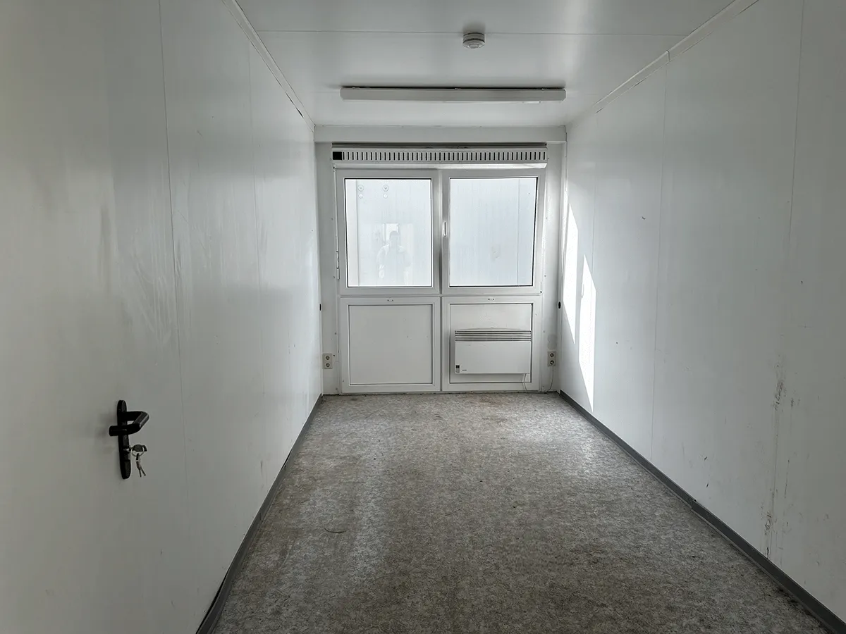 Dieser gebrauchte 20-Fuß-Bürocontainer bietet auf ca. 15 m² Nutzfläche in Kieselgrau eine funktionale Grundausstattung mit Drehkippfenstern inklusive Rollladen, gesicherter Außentür sowie Elektroinstallation (400/230 V, CEE 32 A). Damit eignet sich der Container für den Einsatz als Büro- oder Funktionscontainer. Bemerkungen zum Zustand: Bodenschäden, Bohrlöcher, Elektronikschäden, Geruch, Rost, beschädigte Zierleisten sowie optische Gebrauchsspuren im Innen- und Außenbereich. Außenmaße: 6.055 × 2.435 × 2.890 mm.