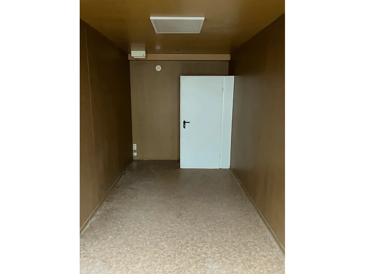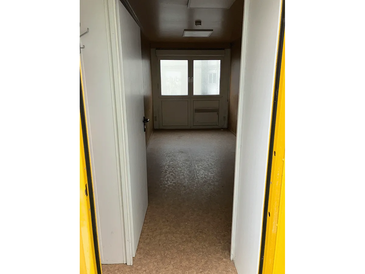 Dieser gebrauchte 20-Fuß-Bürocontainer bietet auf ca. 15 m² Nutzfläche eine funktionale Lösung mit integriertem Windfang, der den Innenbereich bei wechselnden Witterungsverhältnissen schützt. Innenwände in Eiche-/Holzoptik, 2 LED-Paneele sowie Drehkippfenster mit Rollladen sind vorhanden. Eine Elektroinstallation (400/230 V, CEE 32 A) ermöglicht den Einsatz als Baustellen- oder Projektbüro. Bemerkungen zum Zustand: Bodenschäden, Geruch, fehlende Heizung, Rost sowie optische Gebrauchsspuren im Innen- und Außenbereich. Außenmaße: 6.055 × 2.435 × 2.890 mm.