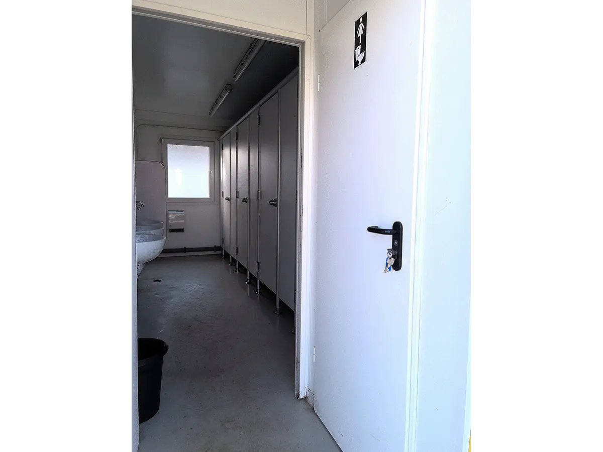 Dieser gebrauchte 20-Fuß-Sanitärcontainer bietet mit fünf WC-Kabinen (4+1-Konfiguration) eine für größere Teams geeignete Sanitärlösung. Mehrere Drehkippfenster mit Rollladen, eine gesicherte Außentür sowie ein stirnseitiger Wasseranschluss sind vorhanden; keine Trinkwassereignung. Eine Elektroinstallation (400/230 V, CEE 32 A) ermöglicht den Einsatz auf Baustellen oder temporären Standorten. Standort des Containers ist Frankenberg/Sachsen. Bemerkungen zum Zustand: Bodenschäden sowie optische Gebrauchsspuren im Innen- und Außenbereich. Außenmaße: 6.055 × 2.435 × 2.890 mm.