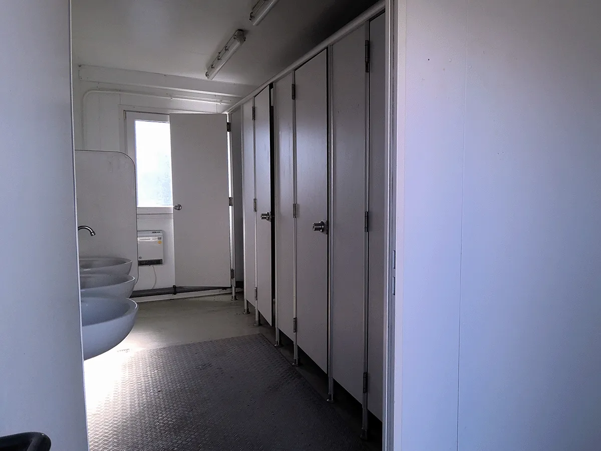 Dieser gebrauchte 20-Fuß-Sanitärcontainer in Kieselgrau bietet eine funktionale Ausstattung mit WC-Kabinen, Urinalen sowie einem seitlichen Eingang und eignet sich für den Einsatz auf Baustellen oder temporären Standorten. Mehrere Drehkippfenster mit Rollladen sowie ein stirnseitiger Wasseranschluss sind vorhanden; keine Trinkwassereignung. Standort des Containers ist Frankenberg/Sachsen. Bemerkungen zum Zustand: Bodenschäden, Geruch, beschädigtes Inventar sowie optische Gebrauchsspuren im Innen- und Außenbereich. Außenmaße: 6.055 × 2.435 × 2.890 mm.