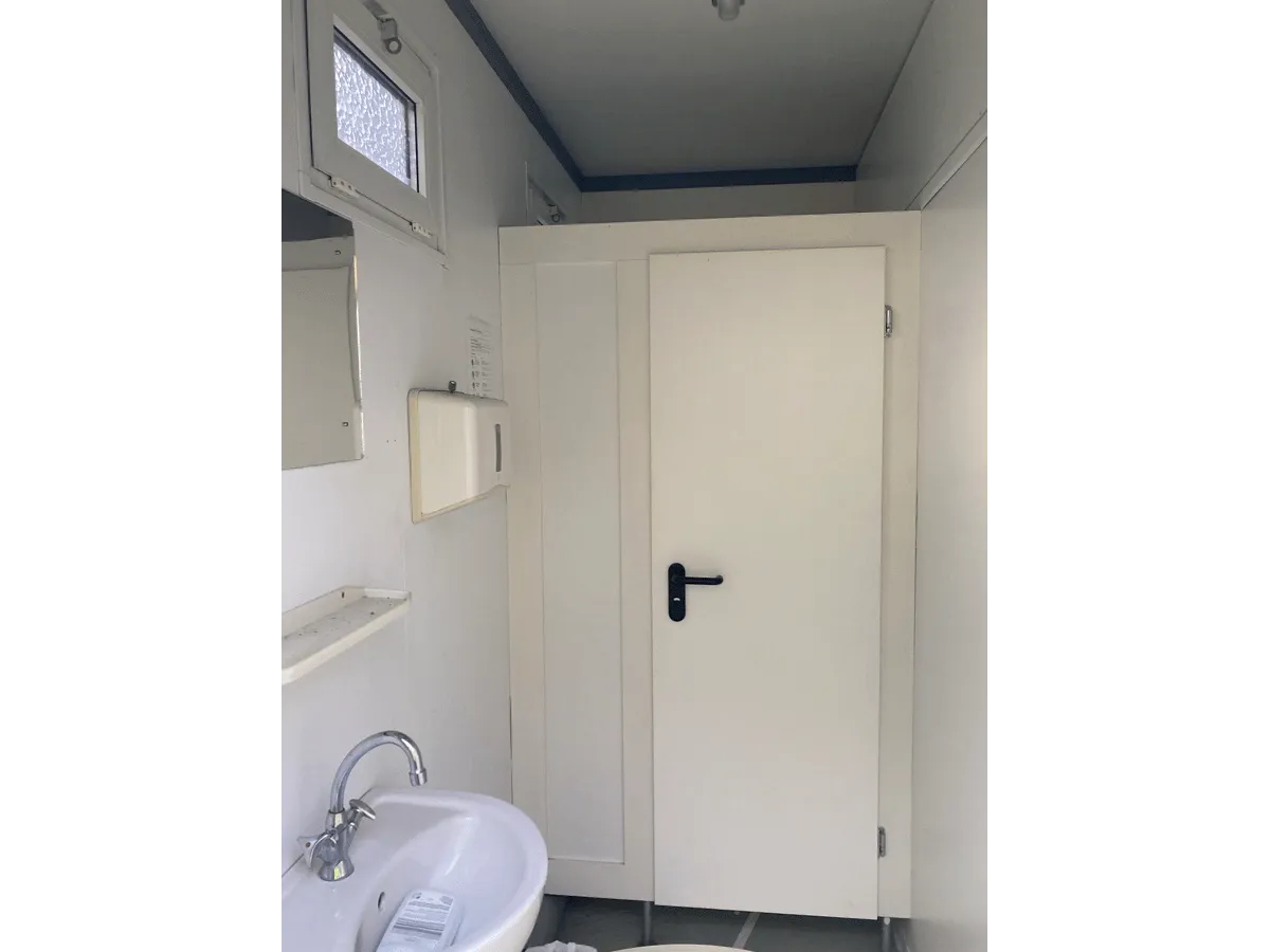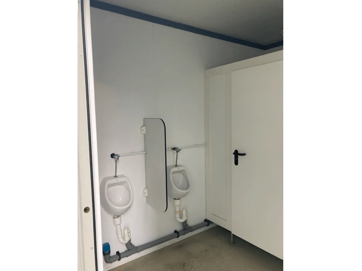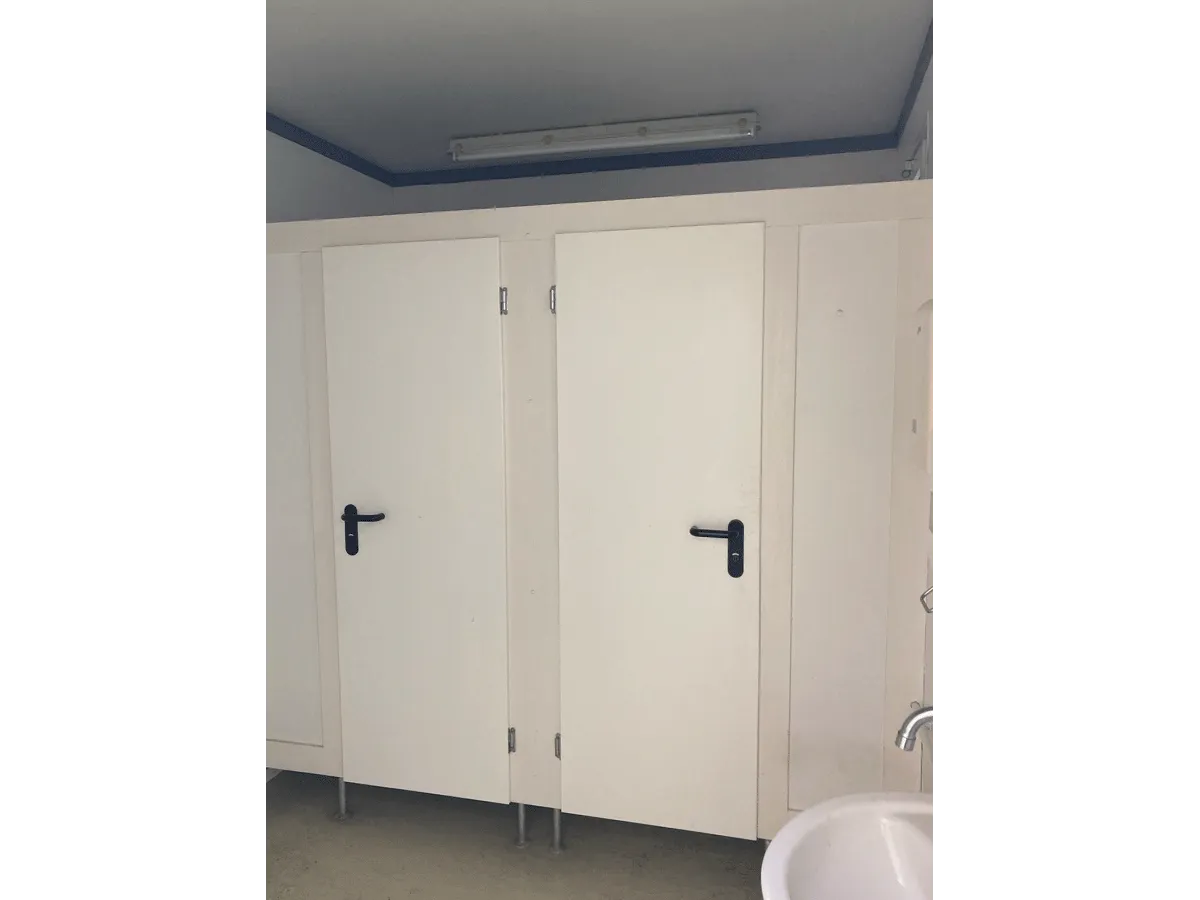 Dieser gebrauchte 20-Fuß-Sanitärcontainer in Kieselgrau bietet getrennte WC-Bereiche für Damen und Herren mit zwei gesicherten Außentüren. Die Aufteilung ermöglicht eine klare Trennung der Nutzung im gewerblichen Umfeld. Zur Ausstattung gehören LED-Feuchtraumleuchten, eine Deckenleuchte sowie eine Elektroinstallation (400/230 V, CEE 32 A). Der Wasseranschluss befindet sich längsseitig; eine Nutzung als Trinkwasser ist nicht vorgesehen. Bemerkungen zum Zustand: Bodenschäden sowie optische Gebrauchsspuren im Innen- und Außenbereich. Maße: 6.055 × 2.435 × 2.890 mm.